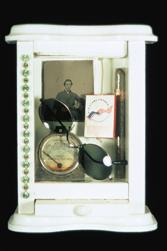 I enjoy the juxtaposition of the antique daguerreotype with the patriotic condom box, in this former gum ball dispenser.